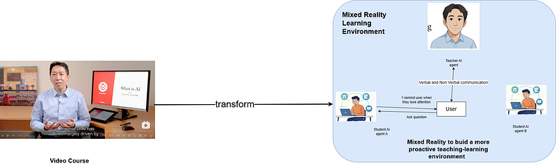 Passive learning is a teacher-centered method where students absorb information by listening, reading, or watching without significant interaction, such as in-person lectures or online video learning. This approach has traditionally been used to deliver large amounts of information to diverse student populations [1]. However, research has documented several drawbacks of passive learning, including decreased learning motivation [2], poor knowledge retention [3], and attention decline during instruction [4]. In contrast, active learning is a student-centered approach that engages students actively and experientially in the learning process [5]. While active learning has demonstrated significant benefits, its implementation faces practical barriers including limited instructor bandwidth, scalability challenges, and time constraints[1]. This work explores how an embodied conversational AI tutor in Mixed Reality can democratize access to personalized, interactive learning experiences by transforming existing passive e-learning content into active tutoring dialogues—preserving content fidelity while enabling learner-initiated interaction at scale.